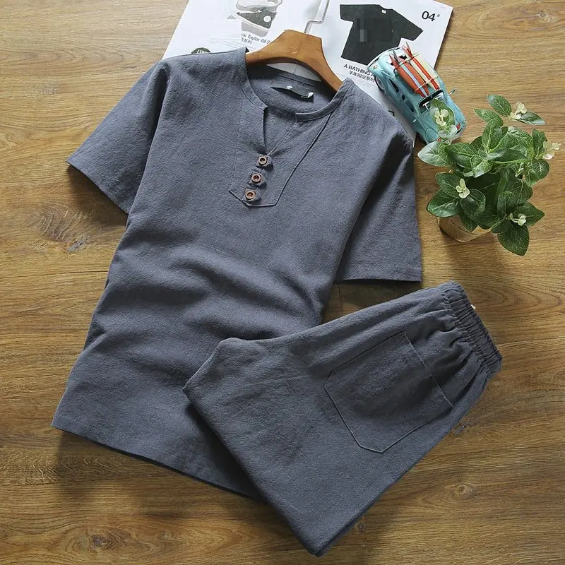low cost plus size big 9XL 10XL summer men linen short sleeve t-shirts and shorts cotton 8XL japan style V-n