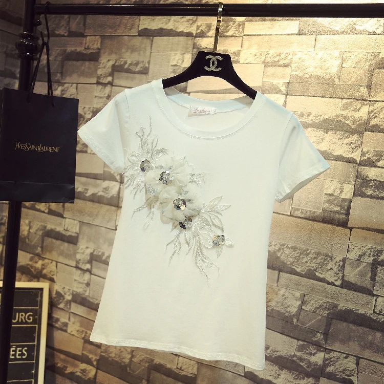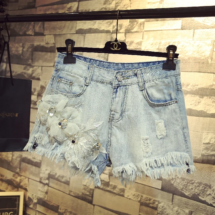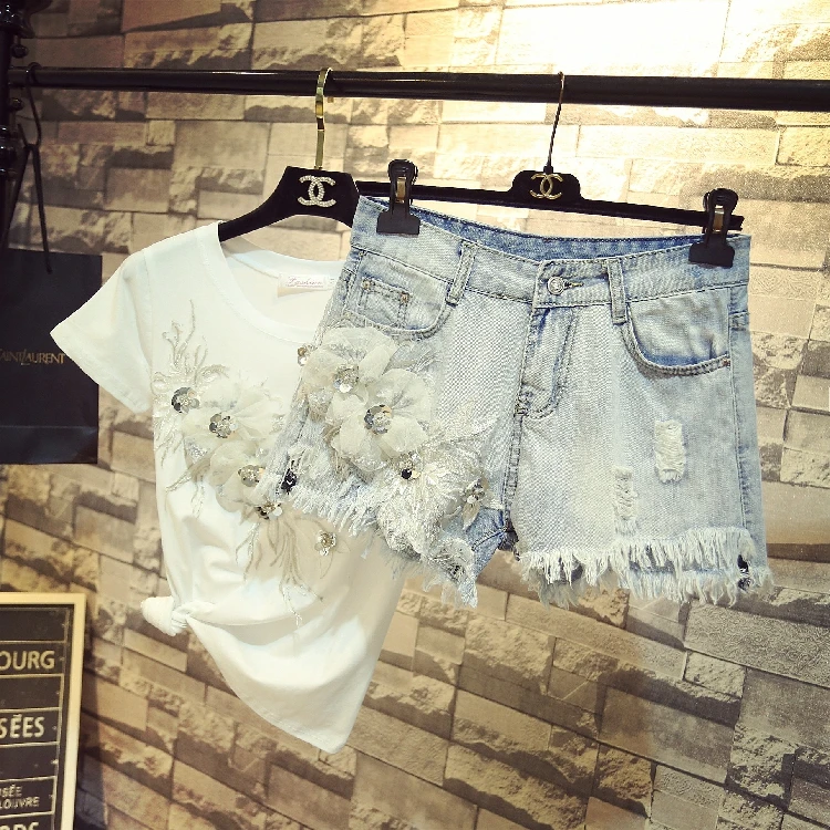 Summer 2019 New Women Flower Diamond Cotton Shirt T-shirt + Wide-legged Jeans Girl Student High Waist Hole Denim Shorts Set,Europe Summer 2018 Woman New Three-dimensional Flowers Embroidered with Sequins Short Sleeved T-shirt + Denim Shorts Suit Sets, Europe Summer 2018 Woman New Three-dimensional Flowers Embroidered with Sequins Short Sleeved T-shirt + Denim Shorts Suit Sets
