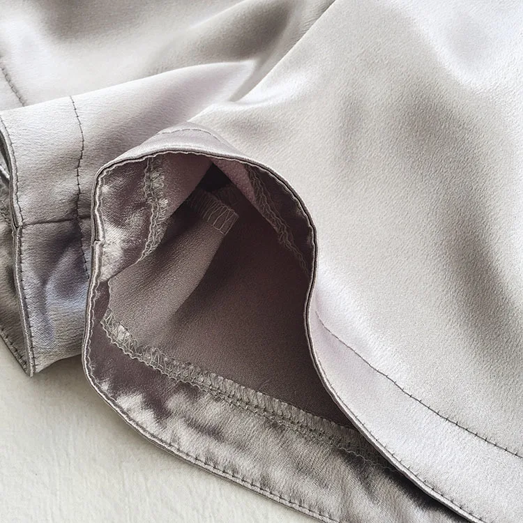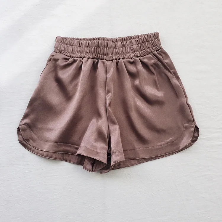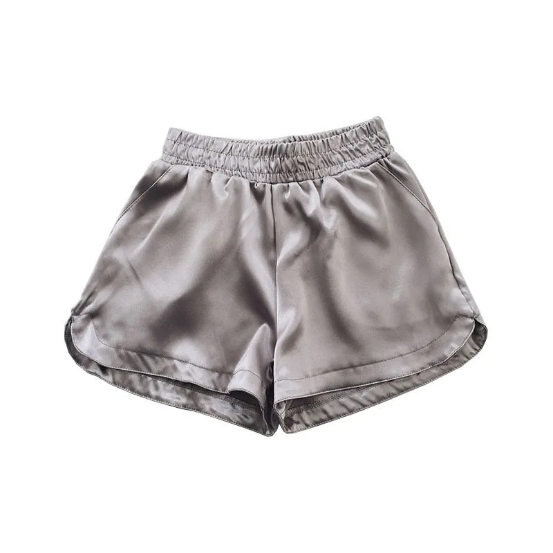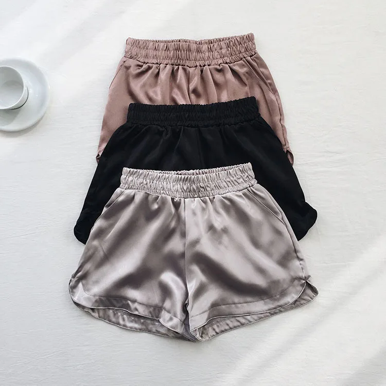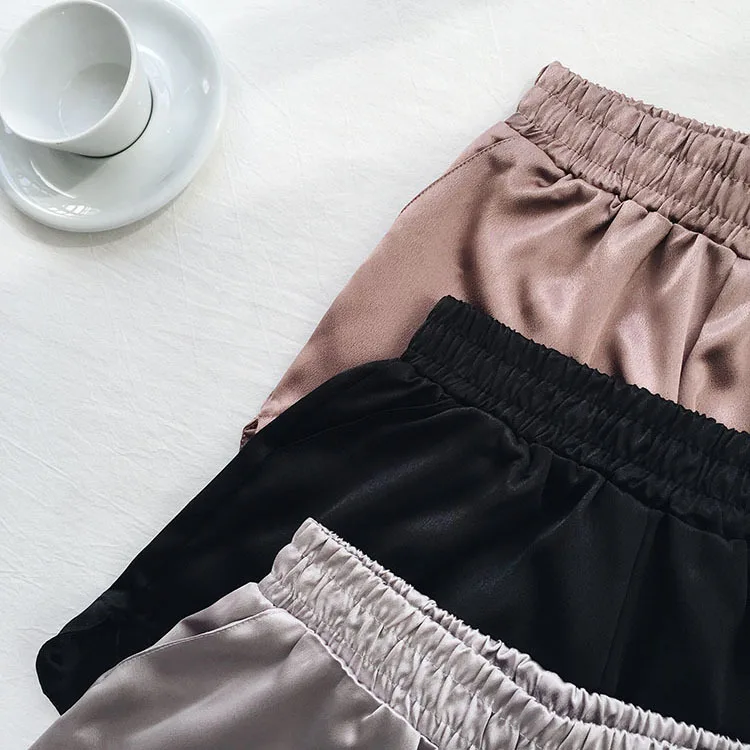 lower price Summer Solid Satin Casual Short Feminino Elastic High Waist Black Silver Wide Leg Trouser Bottom Wo